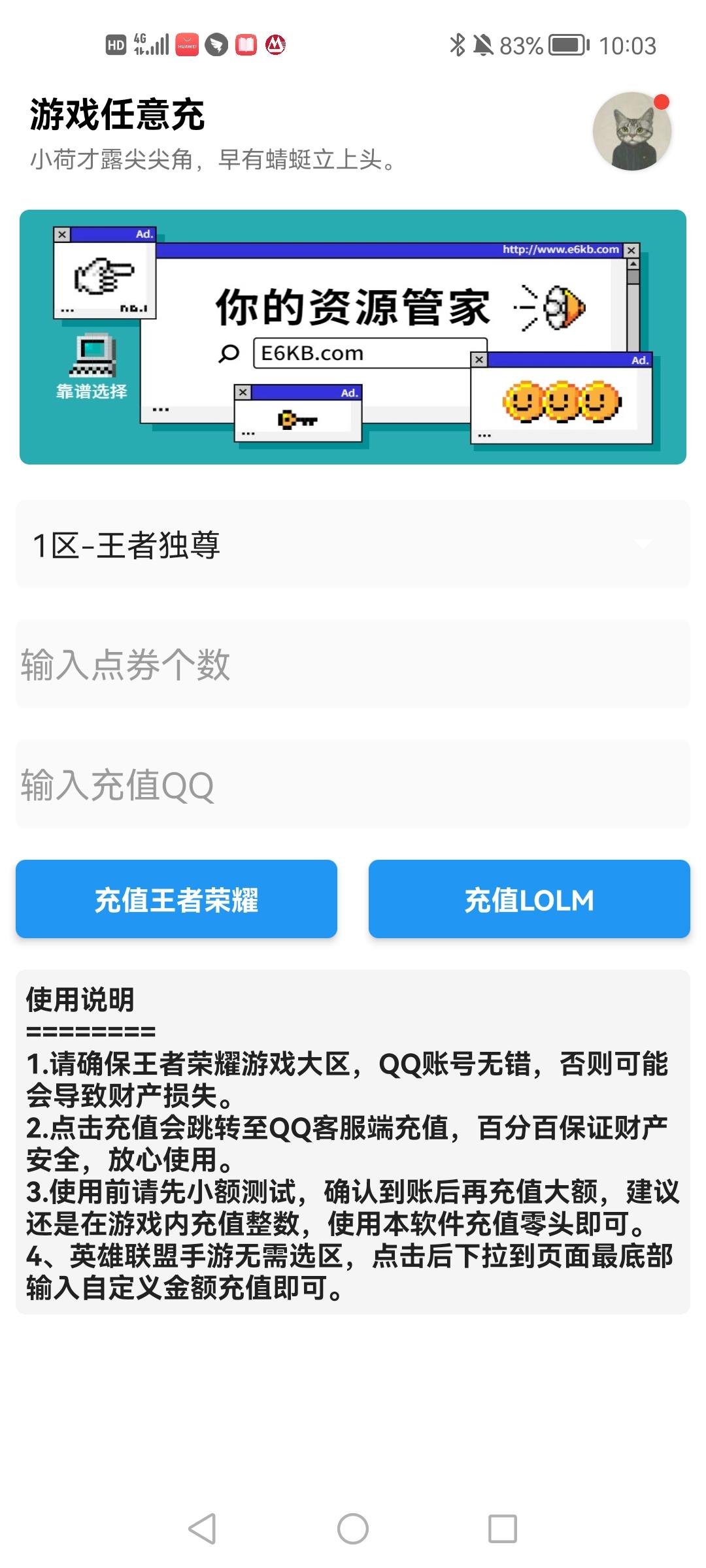 游戏任意充app手机版是一种非常实用的手机游戏充值工具。该软件可以通过国王和大声笑手机游戏玩家的荣誉来使用。它最大的功能是它可以自动补充金额。例如,如果玩家仅缺少0.1元,则无需花费1元,只需在此处输入您想要的金额即可。
