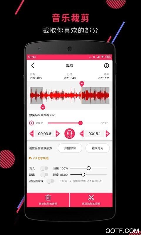 5。音频裁剪主应用程序支持手机铃声,SMS提示声和其他各种提醒的声音的生产。这很容易入门。快来制作独家音乐。