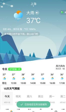 完备的天气信息:15日天气预报、24小时天气预报、空气质量指数、空气污染指数、pm2.5、风力、湿度、温度、日出日落、气压、能见度、根据当日天气状况提供相应的生活建议,紫外线、钓鱼指数、穿衣指数、洗车指数、运动指数、旅游指数一手掌握!