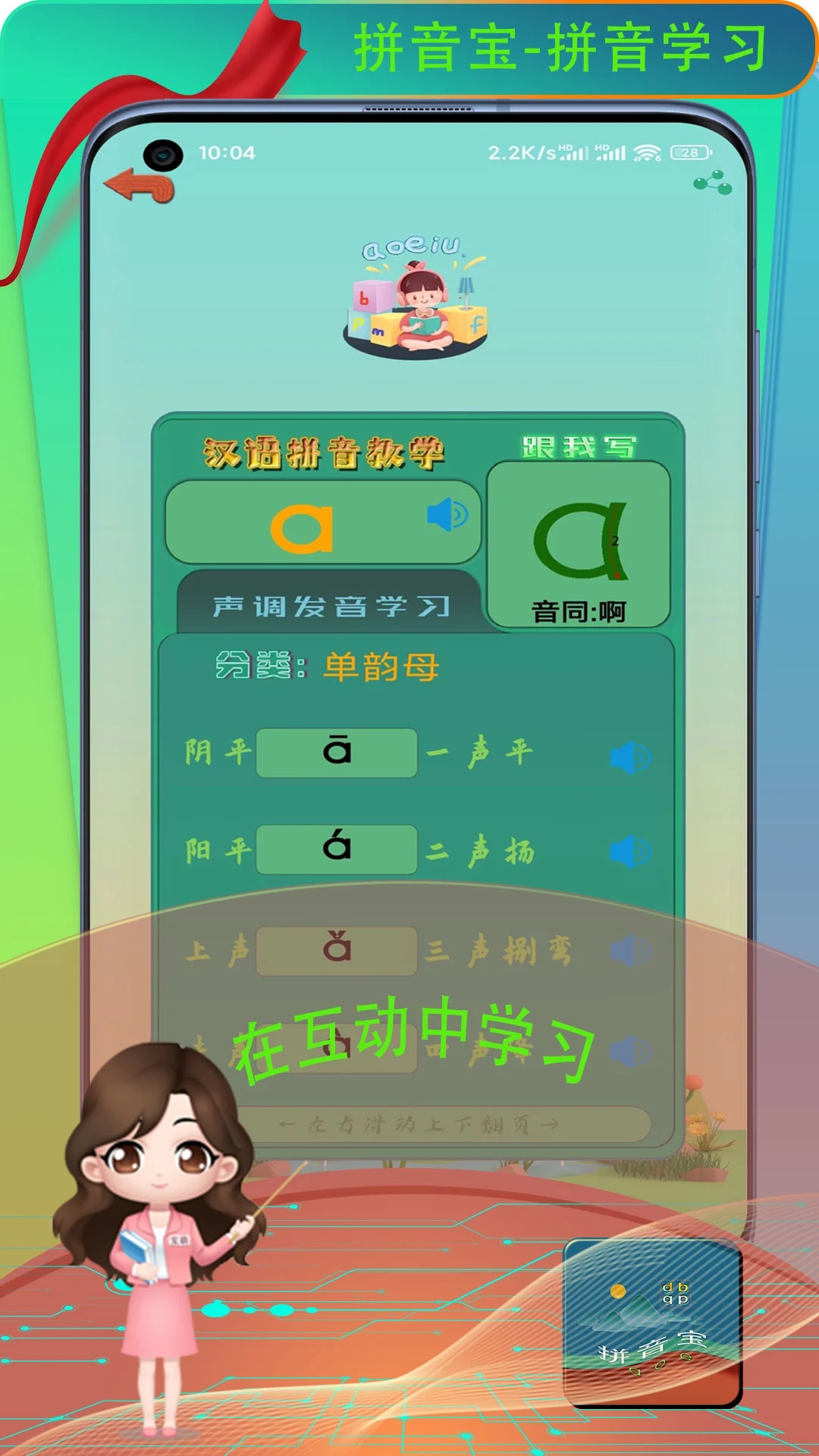 拼音宝是一款专为儿童设计的教育软件,旨在帮助他们学习和掌握拼音知识。该软件由专业教育团队研发,结合了丰富的教学资源和趣味性的互动游戏,让孩子们在轻松愉快的氛围中学习拼音。