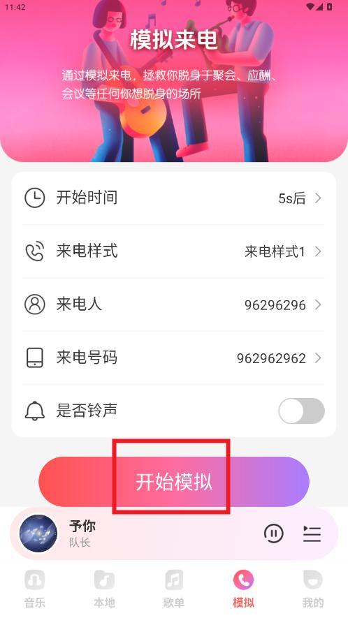 点击模拟,输入开始时间,来电样式,来电人,来电号码,点击开始模拟