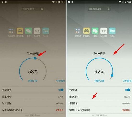 这个其实要看个人喜好的,小编无法给出最合适的配置,例如小编角色58%是让自己眼睛最舒服的配置,而小编的同时则是认为92%+绿色才是最舒服的模式,所以想要最适合的配置,还是需要用户自己去zone护眼app中进行调试。