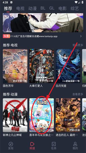1、打开豚豚剧app,点击“频道”选项,选择自己喜欢的电视剧、电影等。