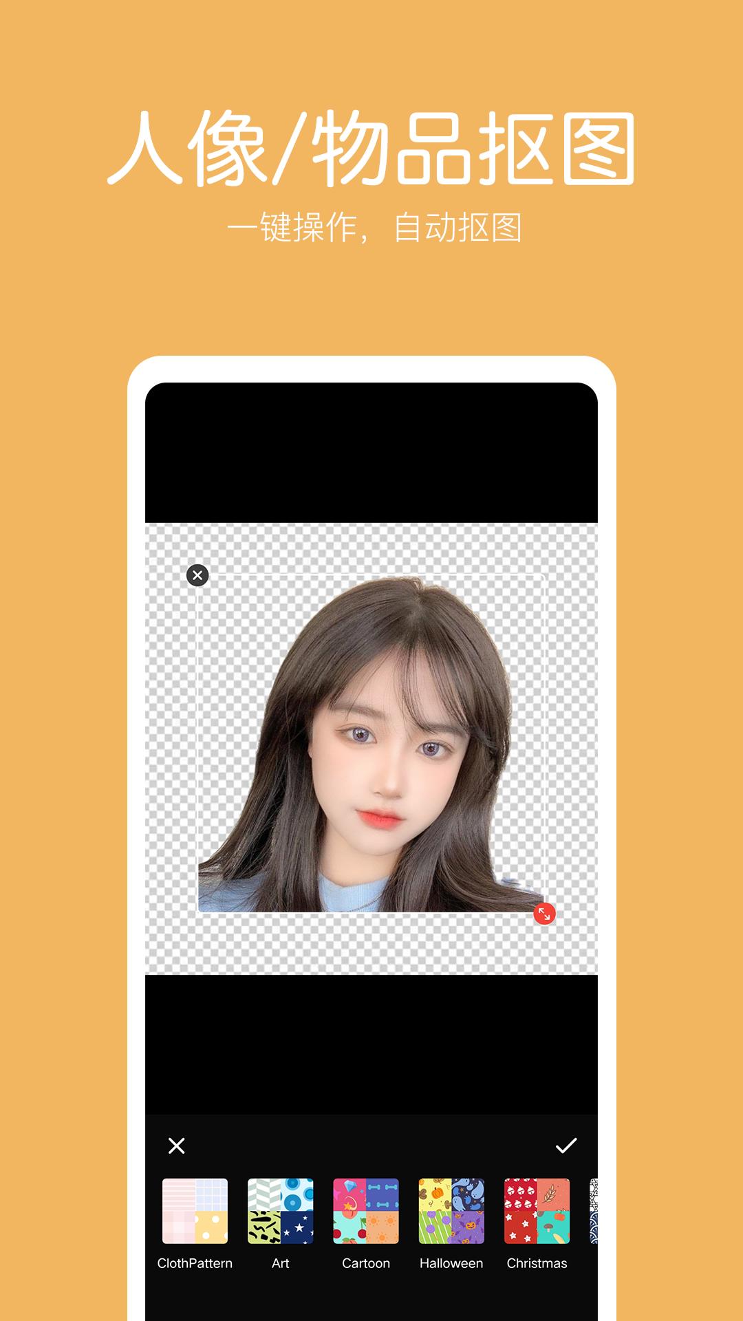 抠图照片编辑是一款简单实用的全自动抠图软件,一键抠人像,轻松换背景;抠出想要的图片元素,生成透明图,结合海量海报背景图,轻松制作海报