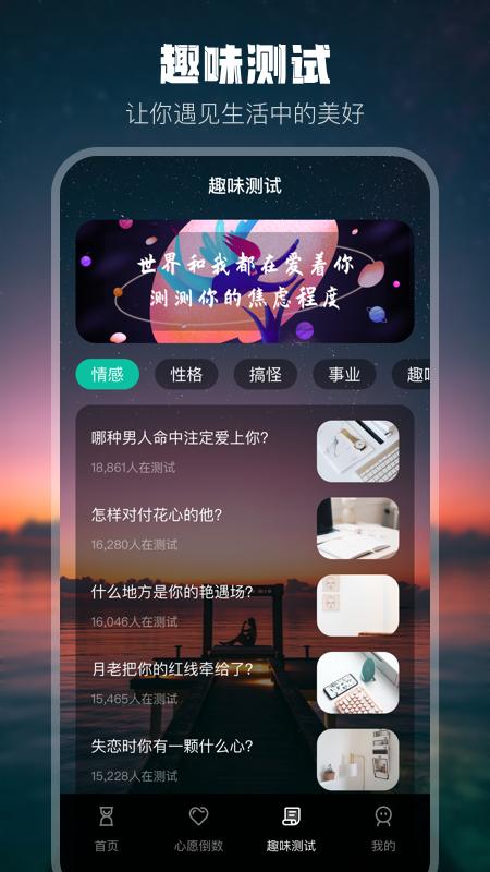 这款APP是一款功能强大的日期记录工具,可以帮助你记录考试倒计时、生日提醒、节假日等各种重要日期。此外,它还提供丰富的趣味测试,涵盖心理、性格、情感和职业等多个方面,帮助你更好地了解自己,做出更明智的选择。无论你想规划未来还是探索内心世界,这款APP都能成为你的得力助手。