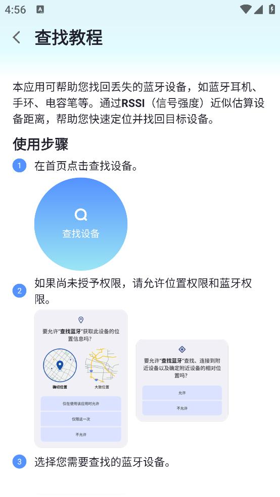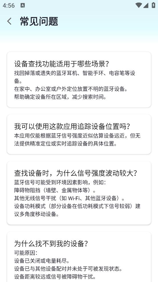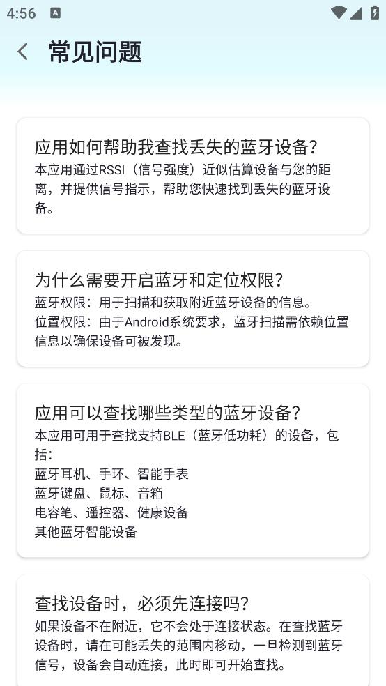 查找蓝牙app是一款实现了手机定位蓝牙查找的软件,这款软件可以不是普通只可以找蓝牙耳机的软件,而是一款可以查找所有连接过手机并且现在蓝牙还开着,但是用户又找不到设备位置软件,软件可以帮助用户能够快速找到自己的设备,是一款很好用的软件。