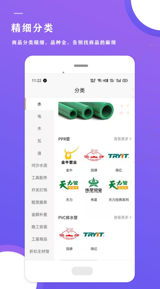用户打开这个软件之后就可以在上面选择自己想要购买的装修材料,而且都为你进行了分类,能够让你在短时间之内就能找到