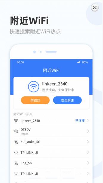 3.软件内部设置了非常强大的网络安全管理模式,实时监测网络的安全,主动防御WIFI的各种风险动态以及消息,让用户在使用过程中保护用户的权益和隐私信息。