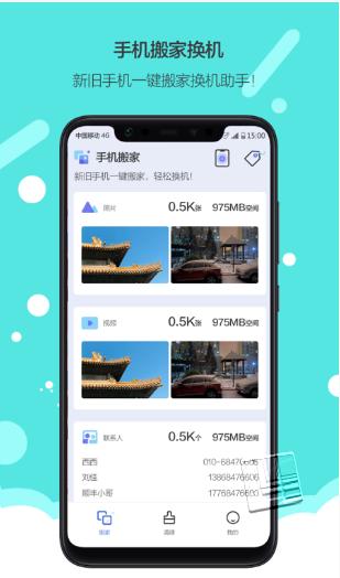 换机搬家app手机换机必备小神器。上面提供的图片、视频、音频资料非常齐全,简单的在线操作,满足您的需求不是问题,快速帮您的手机减肥,需要传输的东西快速在线传输,简单帮您的手机瘦身下来搬家。