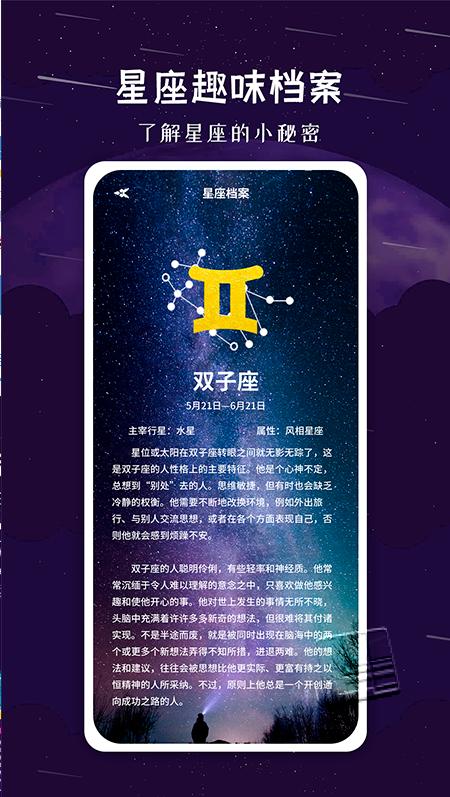 3.一键星座配对,助您找到理想的灵魂伴侣。超全星座档案,十二星座的性格特点尽收眼底。