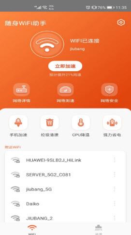 随身WiFi助手app具有多层防护的安全保护网络的流畅性以及安全性,陌生的WiFi也能够安全连接,扫描的速度是非常的快,而且不怎么消耗流量和空间的,实时的检测和占用数据的提醒,通过里面的弹窗,直接一键进行优化了,平台没有流氓软件的携带,下载安装就能够对手机进行各种的扫描和清理,如果想要优化的话,可以体验的。