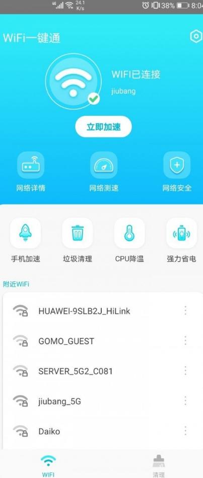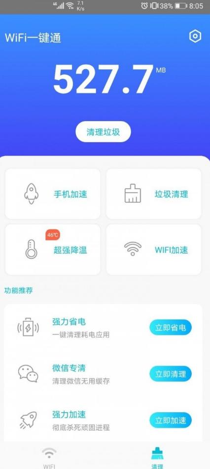2.还能够对自己的网络进行测速,你可以随时的了解到自己的网速运行情况,并且还能够随时清理手机当中的内存垃圾