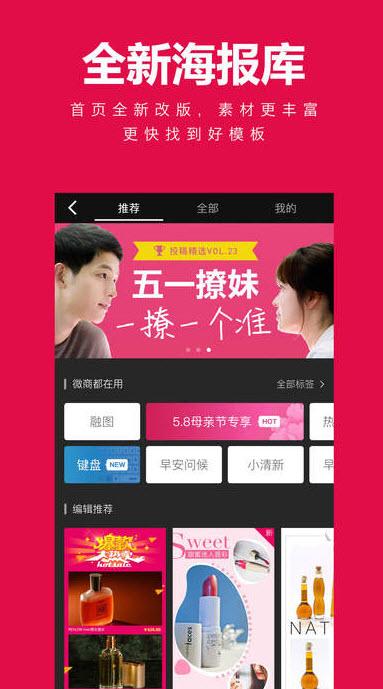 天天向商app是时下最火的微商美颜修图神器,一款功能强大的手机软件!从批量全屏水印到海报广告模板应用,满足微信业务的所有绘图需求。如果你也是微商,还在为美图发愁,快来试试这款软件吧!