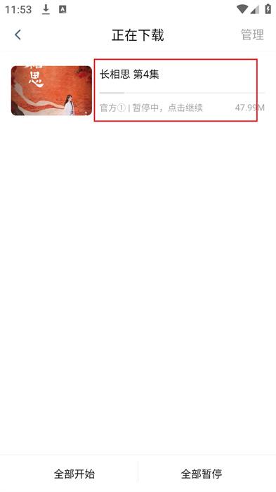 5、在该功能界面中就可以看到正在下载的剧集,如果不想下载了,就可以点击剧集,暂停下载。