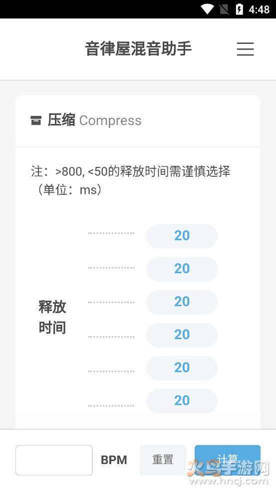 3.压缩是计算释放时间,混响是计算预延迟时间和混响时间,延迟是给出节拍和毫秒的换算对照表。