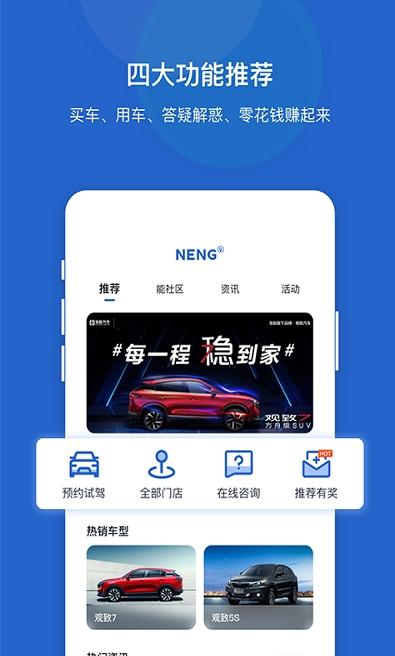 能行app是针对于广大车友所开发的移动应用软件,用户能够通过软件来及时的了解到最细的汽车资讯动态,学习一些比较常见的汽车保养知识,还能够在线的预约试驾,找到志同道合的用户来一起交流汽车的文化和新动态。