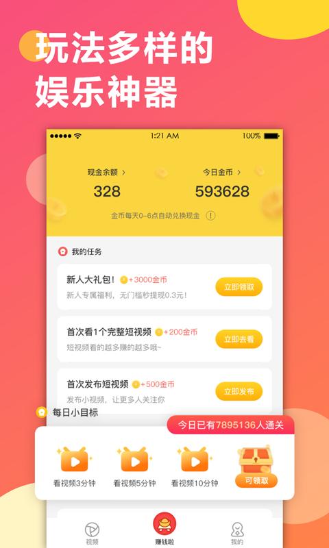 海量精彩视频,边看边赚钱,提现0套路,免审核秒到账,天天领现金。