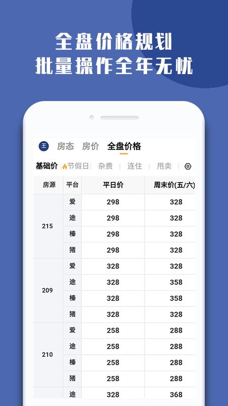 3.一键改价实时同步,拥有基础价、节假日、连住折扣等多种定价方式,一键改价实时同步到所有渠道,无需逐个操作。