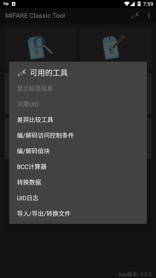 MIFARE Classic Tool (MCT)一个用于对MIFARE Classic RFID标签进行读取、写入、分析等操作的Android NFC应用程序。