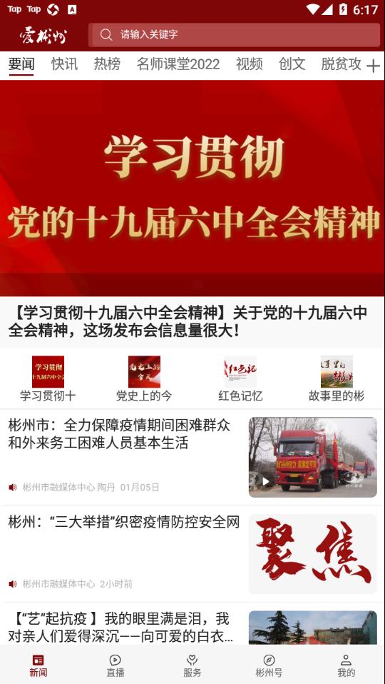 爱彬州开设了新闻、直播、电视、广播、服务、彬州号等栏目,集新闻资讯、政民互动、生活服务为一体。