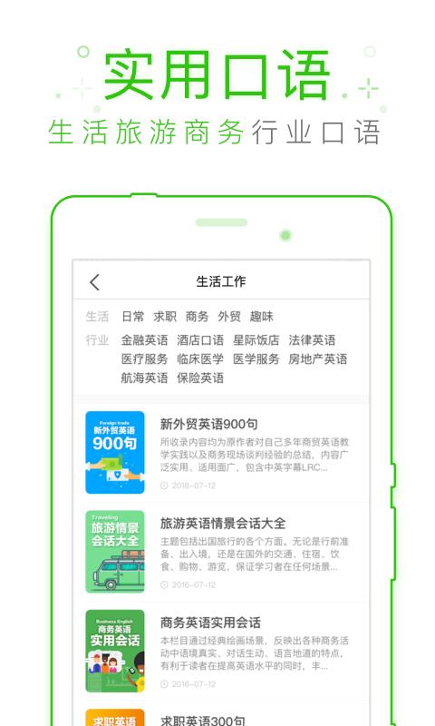 2.海量词库四六级,专四,专八,考研,托业,托福,雅思,高考英语,BEC, GMAT,SAT,TED,自考英语,新闻英语,商务英语应有尽有