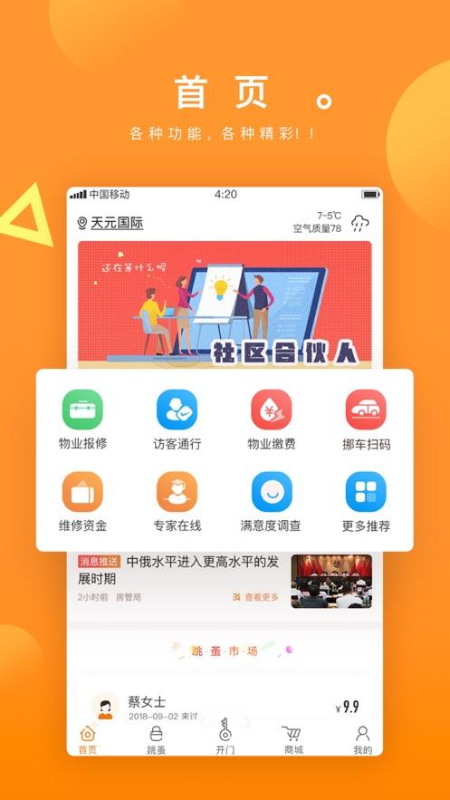 •物业管家:物业公告、小区新闻、在线报修,手机开门访客通行更便捷。