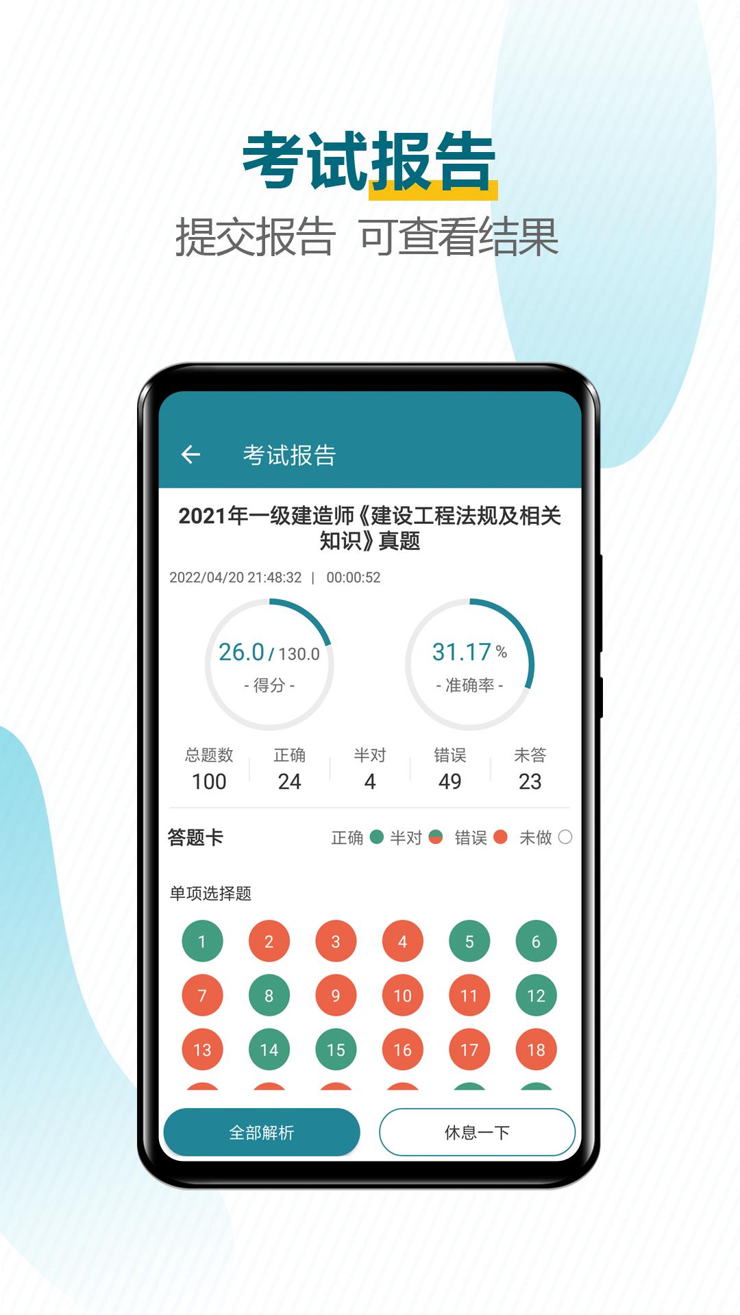 支持在线模考、统计时间、考完还有做题报告;分析用时、准确率,并支持错题自动加入功能。