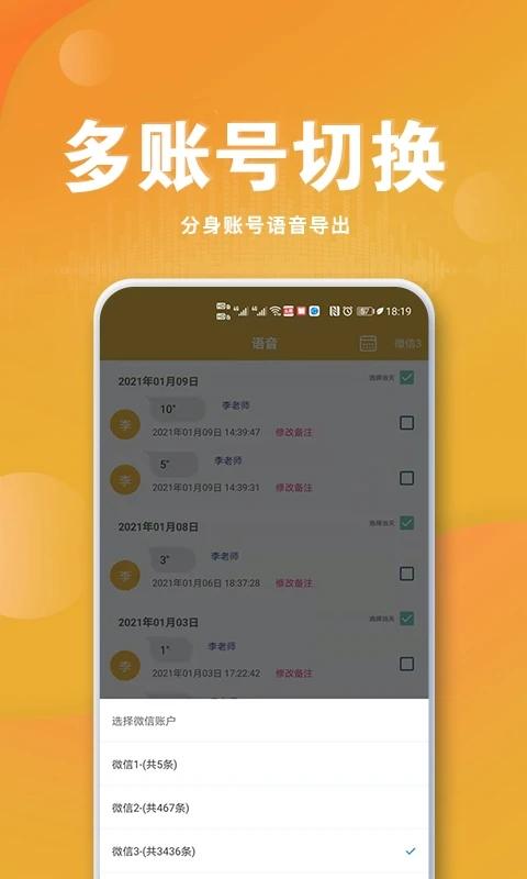 【多账号语音导出】支持多个微信语音的整理,各账号语音将自动获取,再也不用来回切换微信账号翻找需要的语音消息了