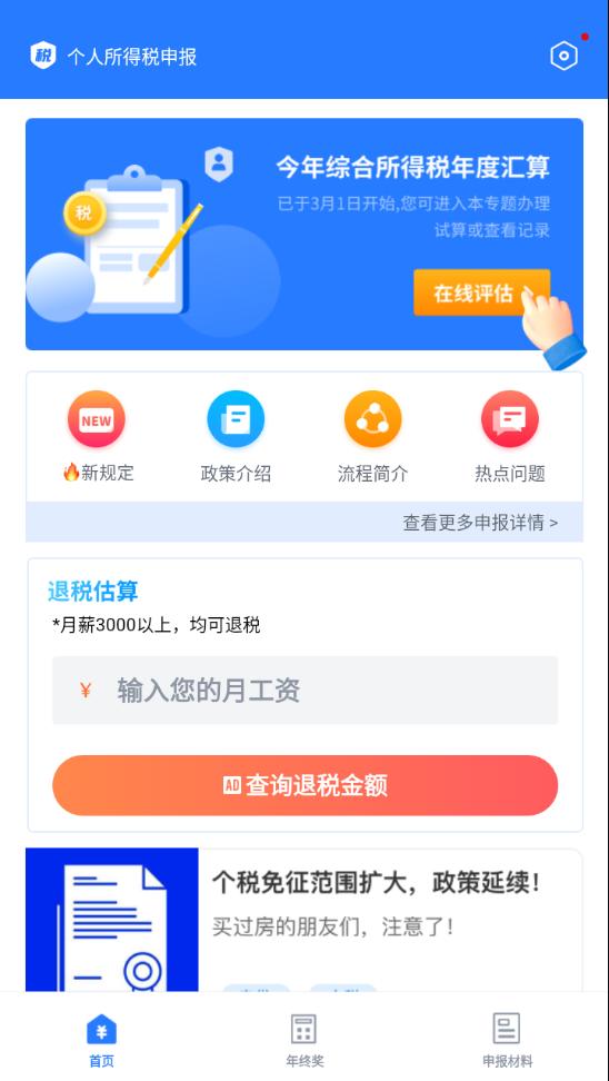 个人所得税管家app是一款由厦门一分仪软件开发有限公司开发打造的个税查询管理软件,在这里输入自己的工资就能查查询到详细的缴税退税金额,还有各种贷款计算工具,帮助你轻松生活。