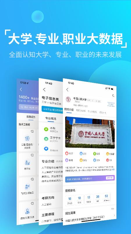 1500+本专科专业详细 介绍,学科要求、就业 方向、薪资情况、开设院校等数据。1680+职业大典职业详细介绍,职业岗位方向, 岗位薪资情况、职业专业技能要求、职业就业分布情况等详细数据。