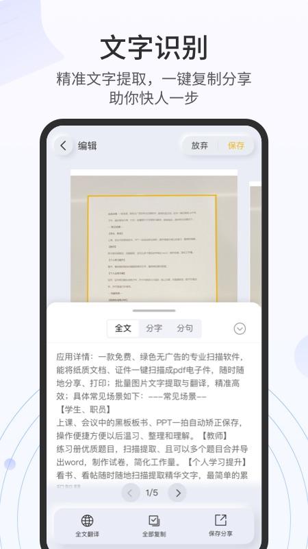 一款免费、绿色无广告的专业扫描软件,能将纸质文档、证件一键扫描成pdf电子件,随时随地分享、打印;批量图片文字提取与翻译,准确高效;