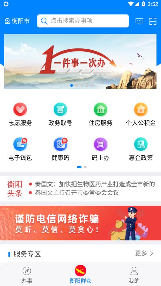 衡阳群众app是专为衡阳制作的政务生活移动服务平台,平台拥有办事,衡阳群众,我的等三大板块,可以帮助更好的服务衡阳,帮助用户更好的衡阳生活。