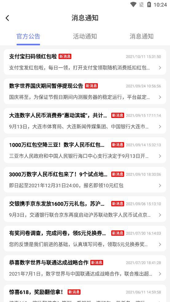 数字世界app是一款非常实用的数字货币资讯软件。软件为用户提供了全面的数字人民币市场动态,上面有各大银行的详细情况,而且我们邀请好友还可以完成任务去领金币的,上面还有一些货币的文章可以了解,非常实用。