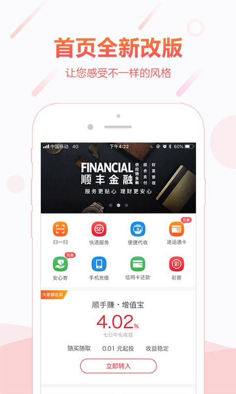顺丰金融app是深圳市顺恒融丰投资有限公司倾情推出,软件拥有掌上钱包,生活服务等等功能,可以给予用户更智慧便捷生活体验,觉得不错的朋友欢迎前来下载使用。