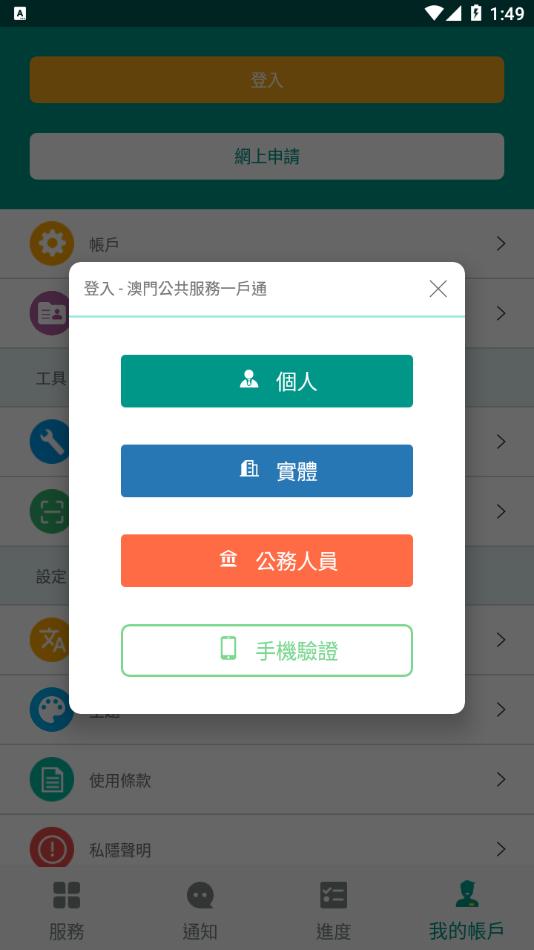 提供澳门公共部门服务电子化的申请,以及接收个人化的讯息通知,进度查询等。