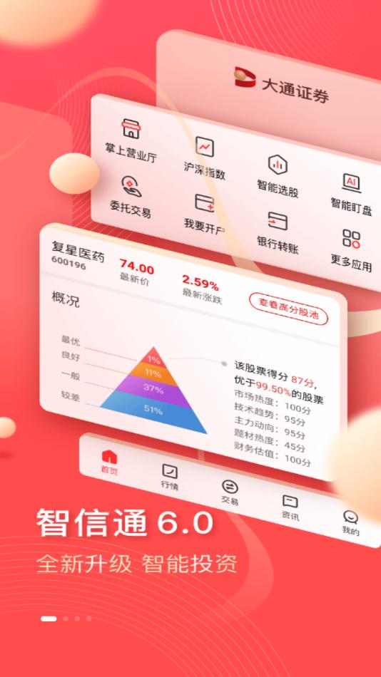 大通证券智信通app是大通证券官方推出,软件拥有行情,交易,资讯,开户等等丰富功能,可以帮助用户更好的投资理财,需要的朋友欢迎前来下载使用。