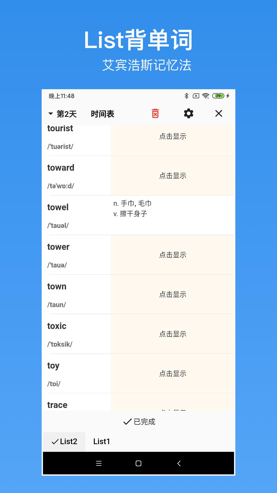 * 「List背单词」:根据艾宾浩斯的记忆规律,第一天记忆单词,后续的复习间隔周期为:第1天,第二天,第四天,第七天和第十五天,并由此制作每日所需记忆的单词计划表。