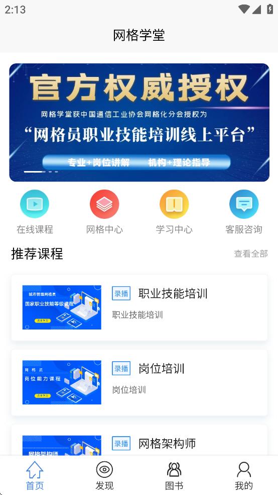 网格学堂APP官方下载是一款网格员职业技能培训线上平台,平台拥有首页,发现,图书,我的等板块,涵盖了在线课程,网格中心,学习中心,客服咨询等等功能,可以帮助用户更好的学习提升能力,网格学堂,网格从业者的精神家园。