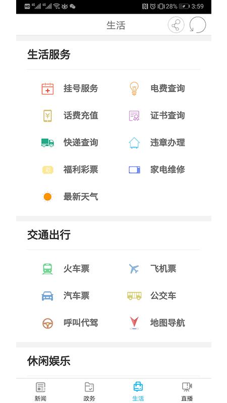 2、点击生活,为用户提供了大量的生活服务供您自由的选择办理
