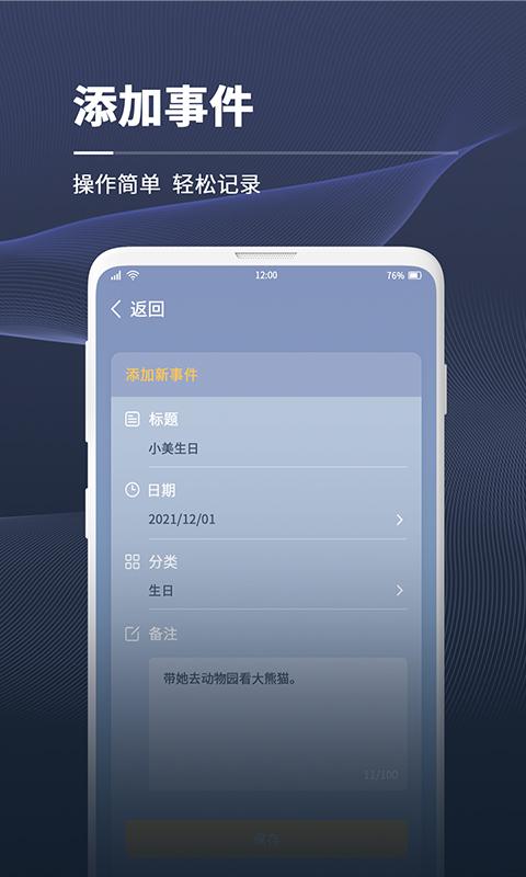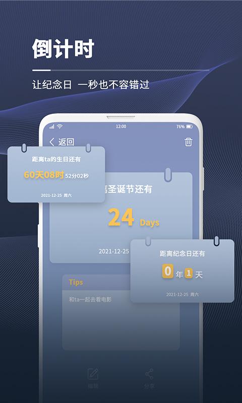 拥有倒计时,倒数日,纪念日,待办事,记事本,备忘录,清单,便签,日期提醒等功能;