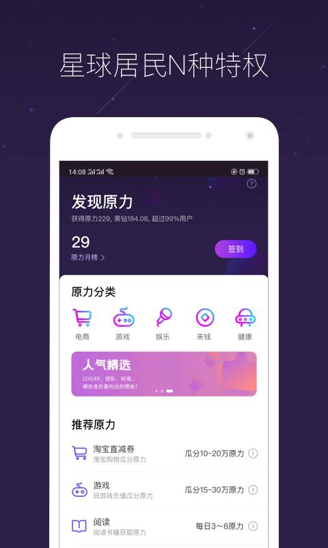 【涨原力】原力决定黑钻的产出速度,拥有的原力值越高,获得黑钻越多,在星球上进行购物、游戏、阅读等活动,可以增加原力值。