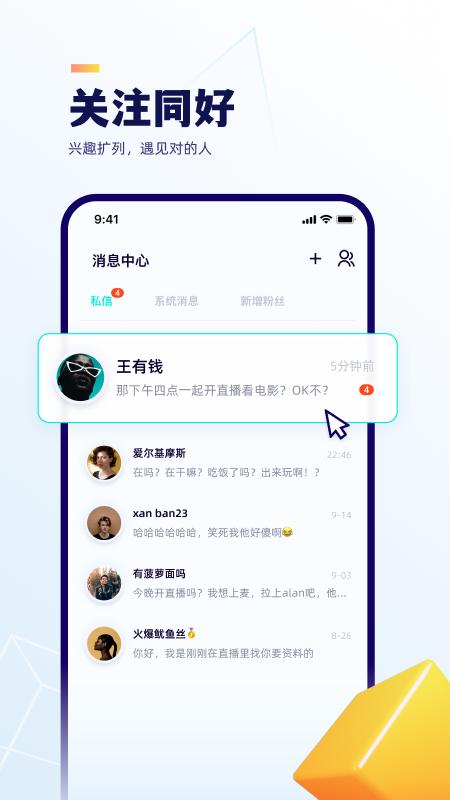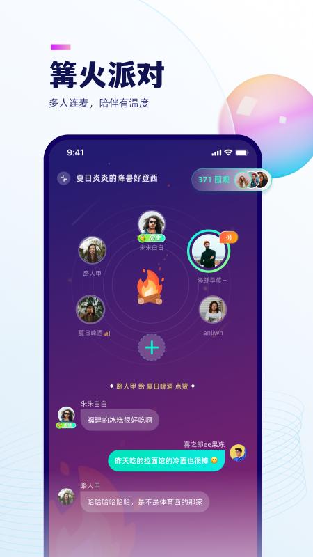 - 以兴趣为基础,以主题为核心,你可以用声音交换热爱;无论是聊童年,梦想,还是旅行,职场,总能遇见经历相似聊伴,开启相见恨晚的聊天;