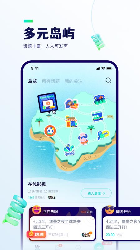 屿聊app是一款由深圳市先于科技有限责任公司开发打造的社交平台,在这里,您不仅可以进行多人语音聊天,还可以与好友一起看电影、一起买东西等等,十分有趣,有需要的朋友可以来下载。