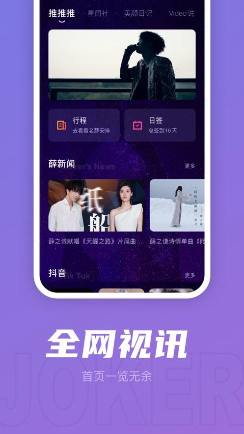 JOKER XUE官方app是专为薛之谦粉丝制作,软件拥有薛之谦官方实时动向,新闻,全网视讯等等内容,还可以粉丝互动交流等等,喜欢的朋友欢迎前来下载使用。