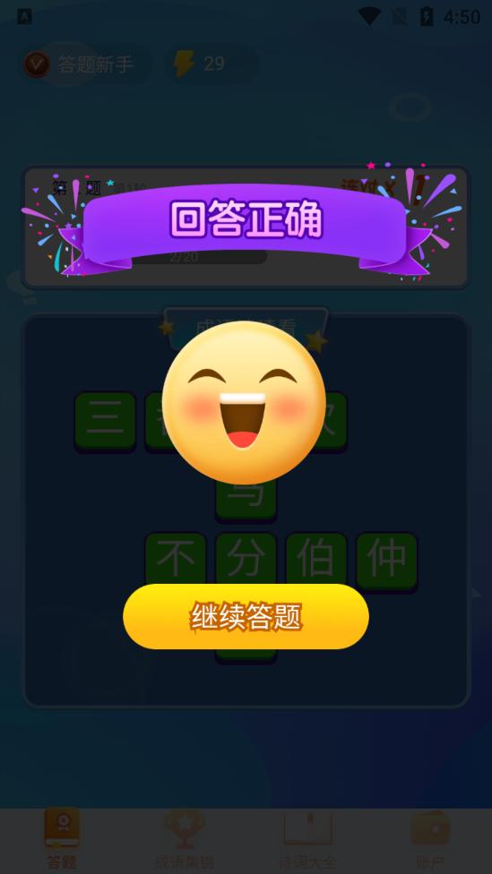 5、满0.3元提现,答对一道成语奖励0.9元,随时提现!