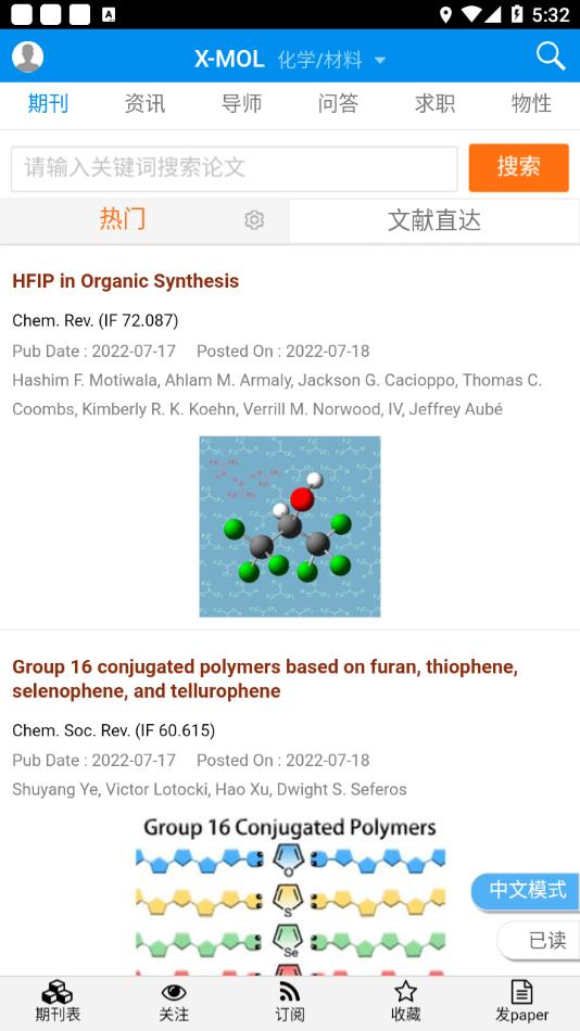 学术期刊:包括Nature、Science、Nature Chemistry、JACS等数十种高水平期刊最新论文的信息,图文每日更新,看文献更方便,一目了然。如果您还想看到其它期刊,请联系我们。
