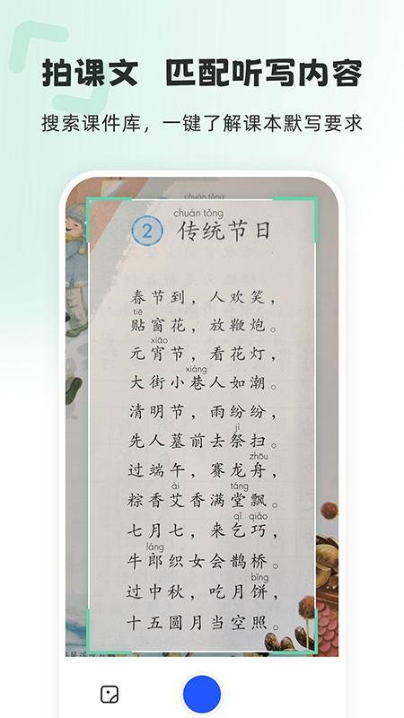 拍摄语文课文首页,APP搜索课件库快速匹配本课听写内容、导出音频,实现学生自主听写。支持中小学语文同步听写,创建本课听写内容快速高效。