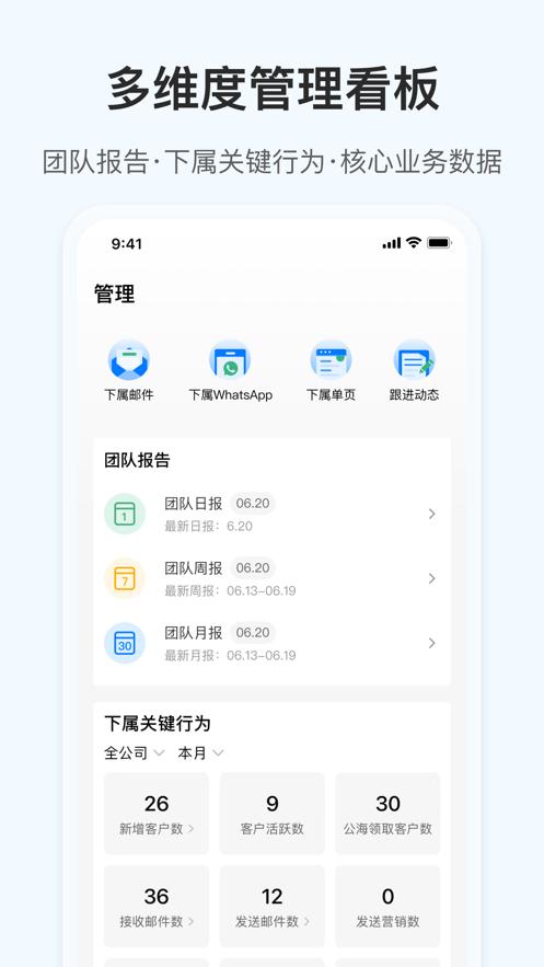 - 新增数据分析模块,按业绩、员工和客户维度分析团队经营状况和下属工作情况