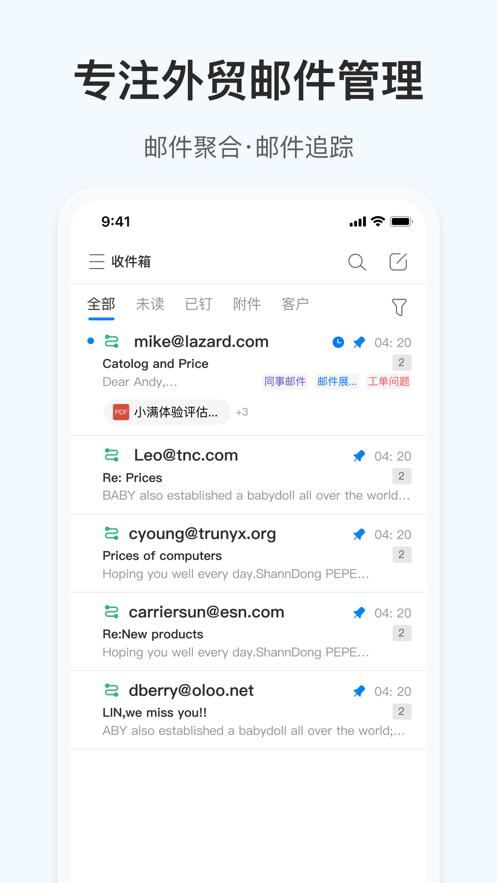 邮件数据多端实时同步更新,新邮件提醒,及时回复客户邮件,锁定每一个商机;联系人卡片,帮助快速识别客户类型,聚合往来邮件,转化邮件线索。