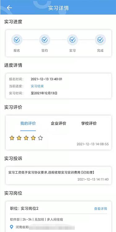实习备案提供学校、指导教师、企业、学生(监护人)和上级教育行政部门等5类参与主体管理端口,实现学生实习线上组织、一般问题线上提出线上反馈、线上实习考核、学生与企业实习互评的全过程权益保障,构建充分尊重学生选择权、各实习参与主体权责明确、阳光透明的实习信息化管理模式。